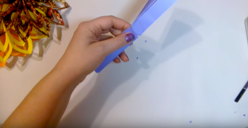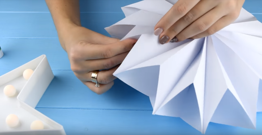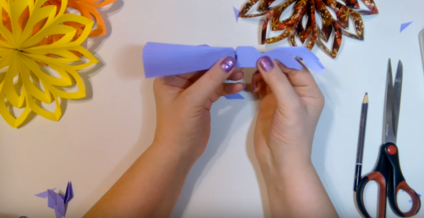 9. Для завершення залишається тільки склеїти разом протилежні кінці фігури і вийде гарна об’ємна сніжинка.