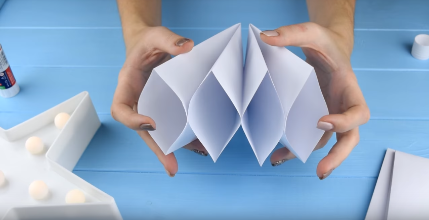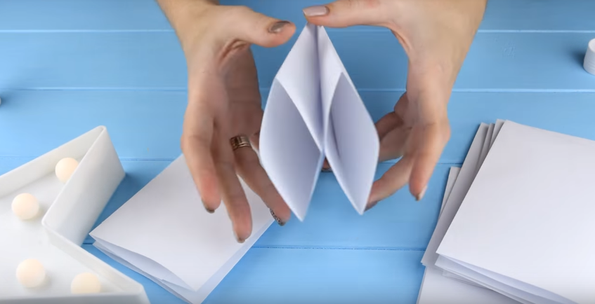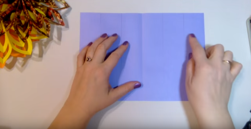 1. Лист А4 потрібно скласти гармошкою. Для цього спочатку складаємо його навпіл, а потім на кожній половинці розмічаємо три однакових ділянки.