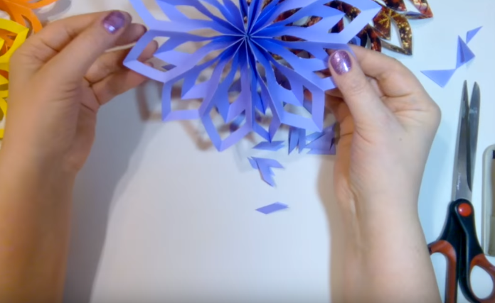 Попередній приклад виготовлення сніжинок хороший для створення малюнків на вікні. А для прикраси кімнати більше підійдуть об’ємні сніжинки. Робити їх теж зовсім не складно.