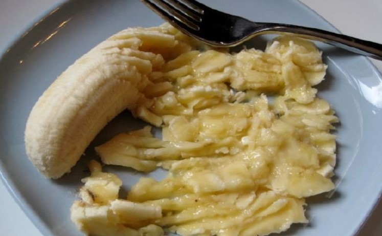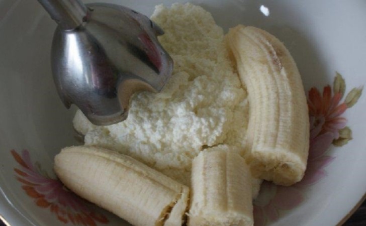 1. Один банан розім’яти виделкою в пюре, додати яйце, цукрову пудру, масло і змішати.