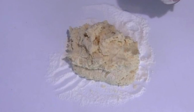 4. У якийсь момент вимішувати тісто лопаткою стане важко. Робочу поверхню треба присипати борошном і продовжити працювати з тестом на ній, додаючи по необхідності ще борошно.