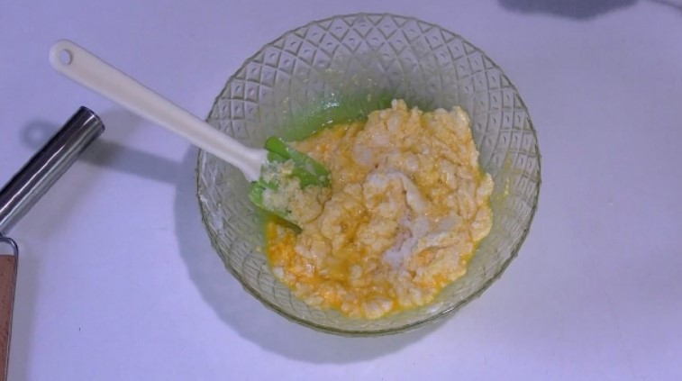 2. Просіяти борошно в яєчну суміш. Спочатку працювати лопаткою, потім вимішувати тісто руками. Воно повинно вийти м’яке, але слухняна. Для того, щоб тісто трохи ущільнилася і відпочило, відправити його в холодильник.