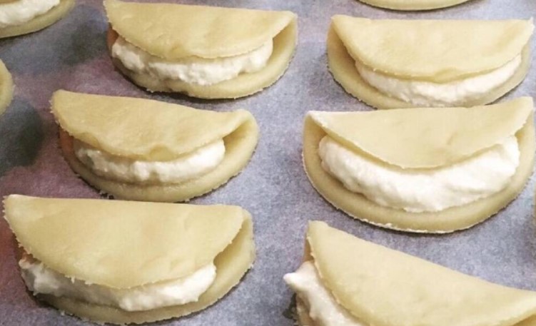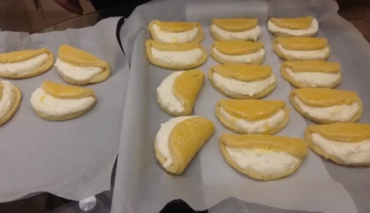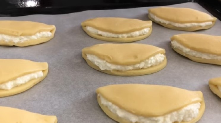 4. Тісто має вийти дуже ніжне, м’яке. Розділити його на порційні колобки. Прямо на аркуші для випічки руками сформувати коржики, викласти на них начинку, скласти тісто в сочник. Заготівлю краще трохи защипнути по сторонах, залишивши відкритими спереду.