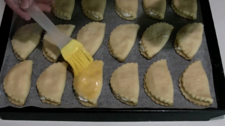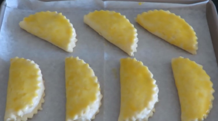 5. З тіста зробити круглі заготовки, товщиною не більше 5-6 мм, розкласти на них начинку. Скласти конвертиком, залишивши край відкритим. Змастити сочники жовтком і відправити в духовку готуватися на ½ години при 180 градусах.