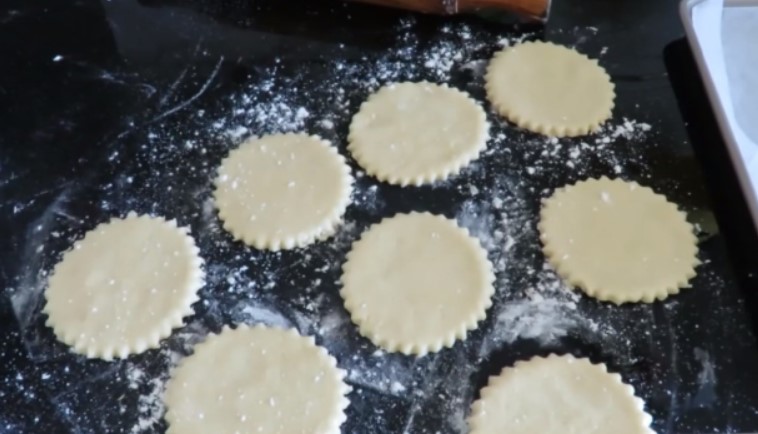 6. Тісто розкачати на посипаній борошном поверхні в пласт товщиною 0,5 див. Вирізати кружечки діаметром 7-12 див.