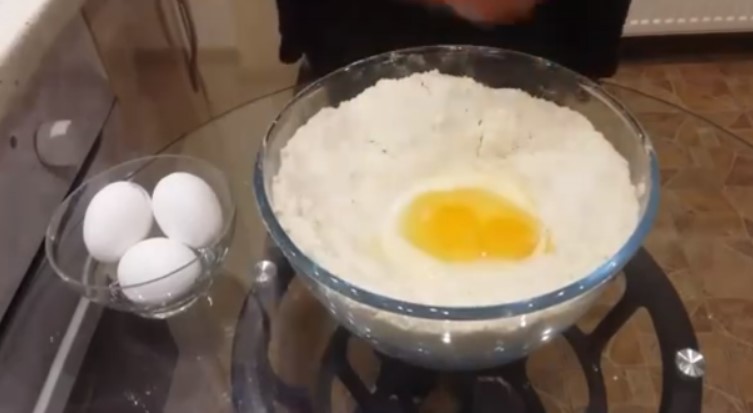 2. До отриманої маси зробити поглиблення, вбити в нього яйця і додати сметану. Спочатку виделкою змішати рідкі продукти, потім захоплюючи борошно з країв отриманого кратера, замісити тісто.