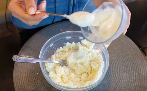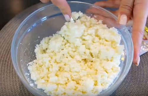Готуємо начинку. В ідеалі, сир краще протерти через сито. Але якщо лінь, просто розімніть виделкою – великий помилки не буде.