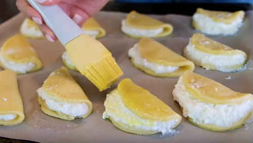 Промажте напівфабрикати яєчним жовтком, що залишився від начинки. Змащуйте тісто і саму начинку.