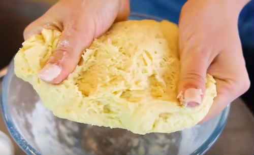 Коли піде вся борошно, тісто стане досить щільною. Відкладіть віночок, почніть розминати його руками.