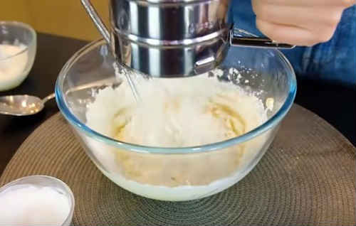 Почніть підсипати борошно, одночасно просіваючи її. Не засинайте відразу всю, щоб уникнути великої кількості грудок. З’явилися відразу розтирайте. На даному етапі додайте харчову соду (або чайну ложечку розпушувача).
