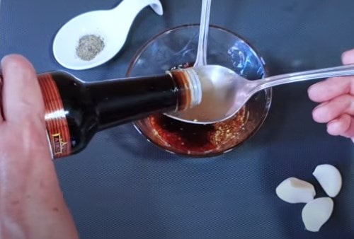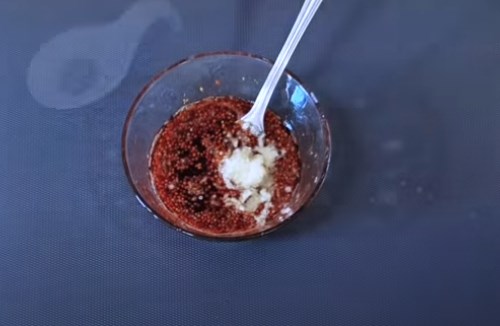 Роздавите за допомогою преса зубчики часнику, засипте перець. Старанно розмішайте маринад.
