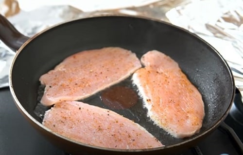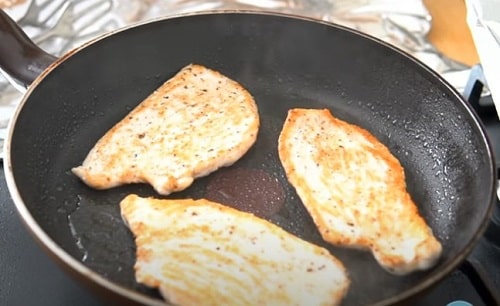 - Розжарити сковороду. Чи не додаючи масла, викладіть заготовки індички. Смажте без олії протягом 1,2-2 хвилин, в залежності від товщини напівфабрикатів.