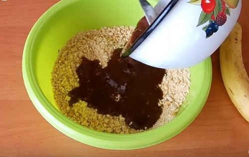 - Перелийте шоколадну масу в миску з печивом, старанно перемішайте, розподіливши по всій крихті.