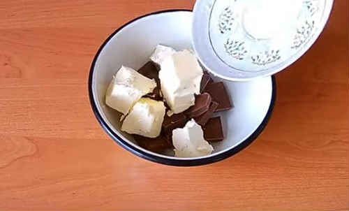 Додайте порізане шматочками вершкове масло. Поставте на водяну баню, прогрівайте, поки продукти не розтопиться.