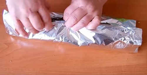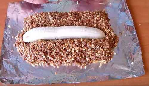 Засипте банан крихтою печива, щоб фрукт був повністю покритий. Потім, піднявши краю фольги, сформуйте трикутник. Верхні краї закріпіть.