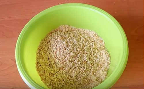 Печиво необхідно подрібнити в крихту. Робіть це будь-яким доступним способом. раніше ми невигадливо складали його в пакет і розкатували качалкою. Зараз до ваших послуг кухонний комбайн, блендер.