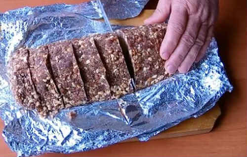 - Загорніть отриману масу в пергамент, надайте обриси батона ковбаси. Покладіть в холодильник, потерпіть 3-4 години, щоб десерт застиг.