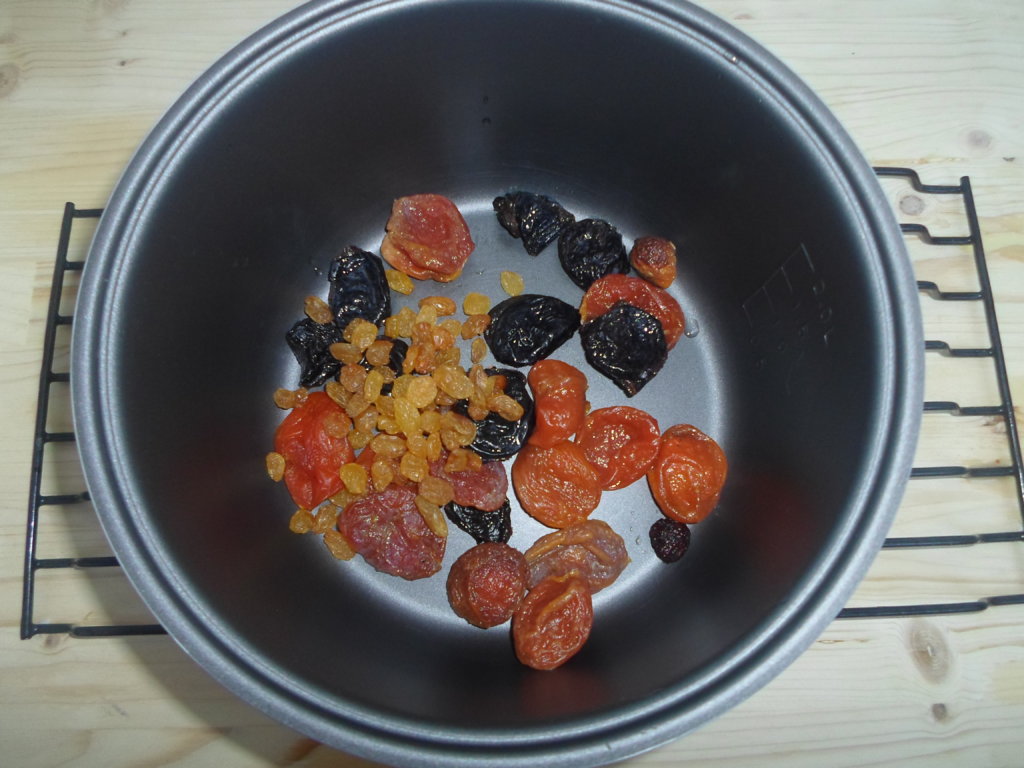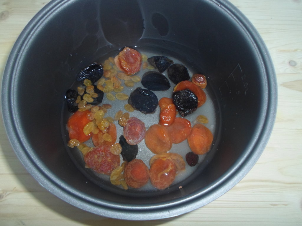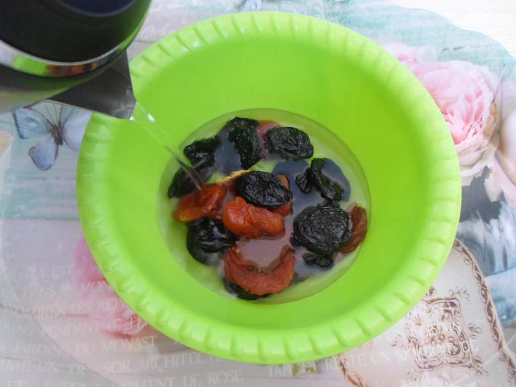 Вимийте сушені фрукти, покладіть в зручну миску і теж залийте киплячою водою.