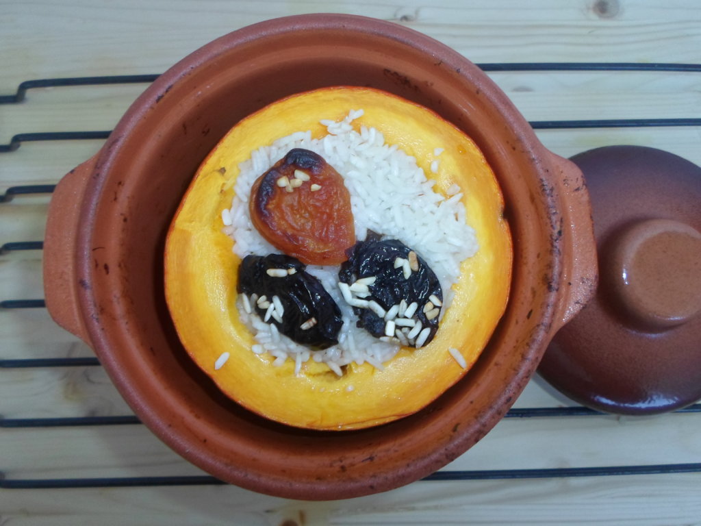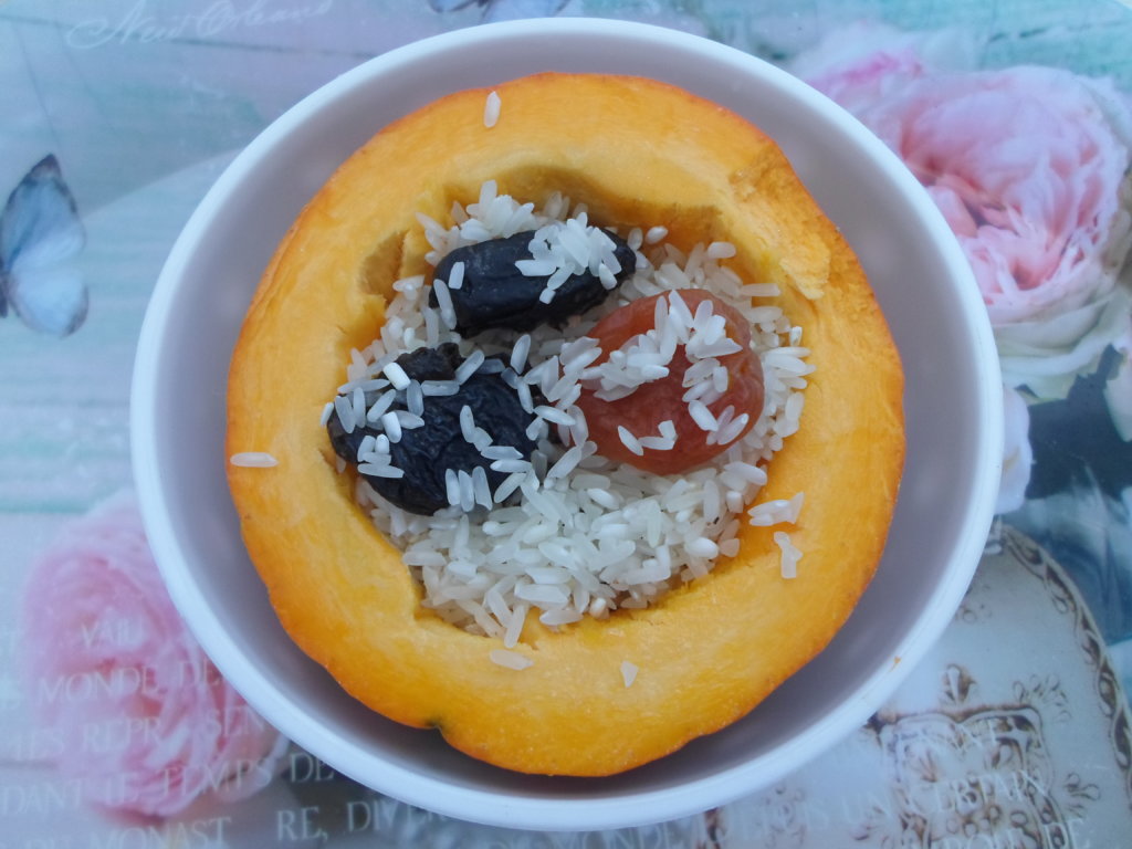 Вилийте з гарбуза воду і наповніть її рисовою сумішшю (не дуже щільно).