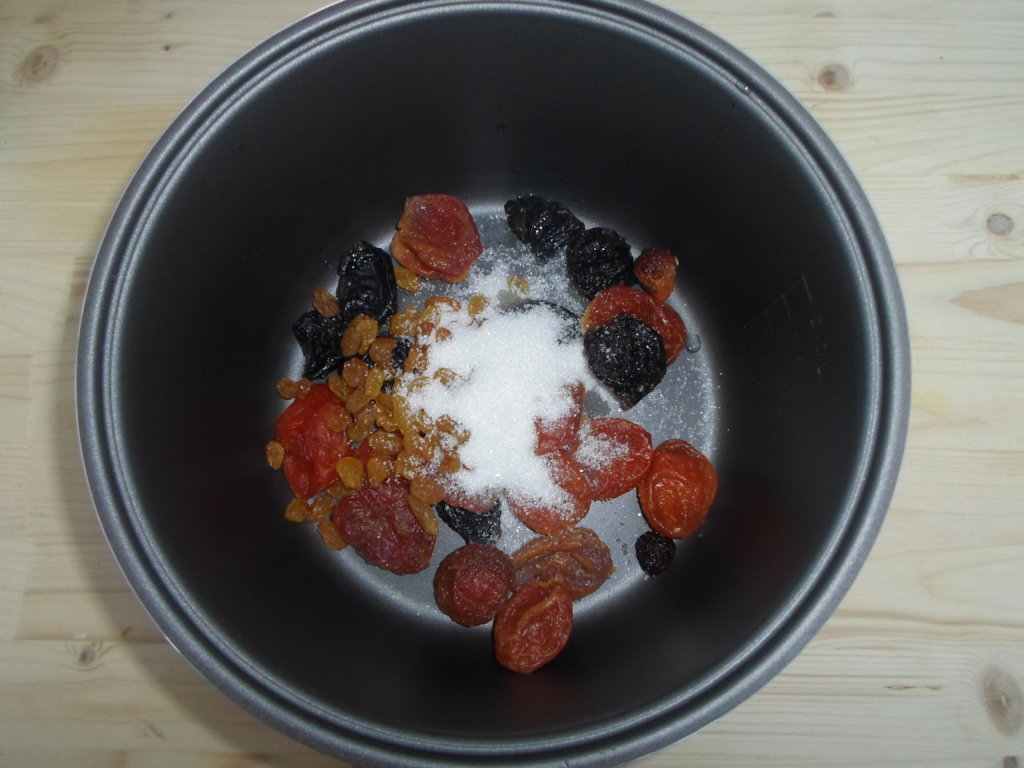 Налийте в чашу мультиварки трохи рослинного масла і покладіть курагу, чорнослив і родзинки.