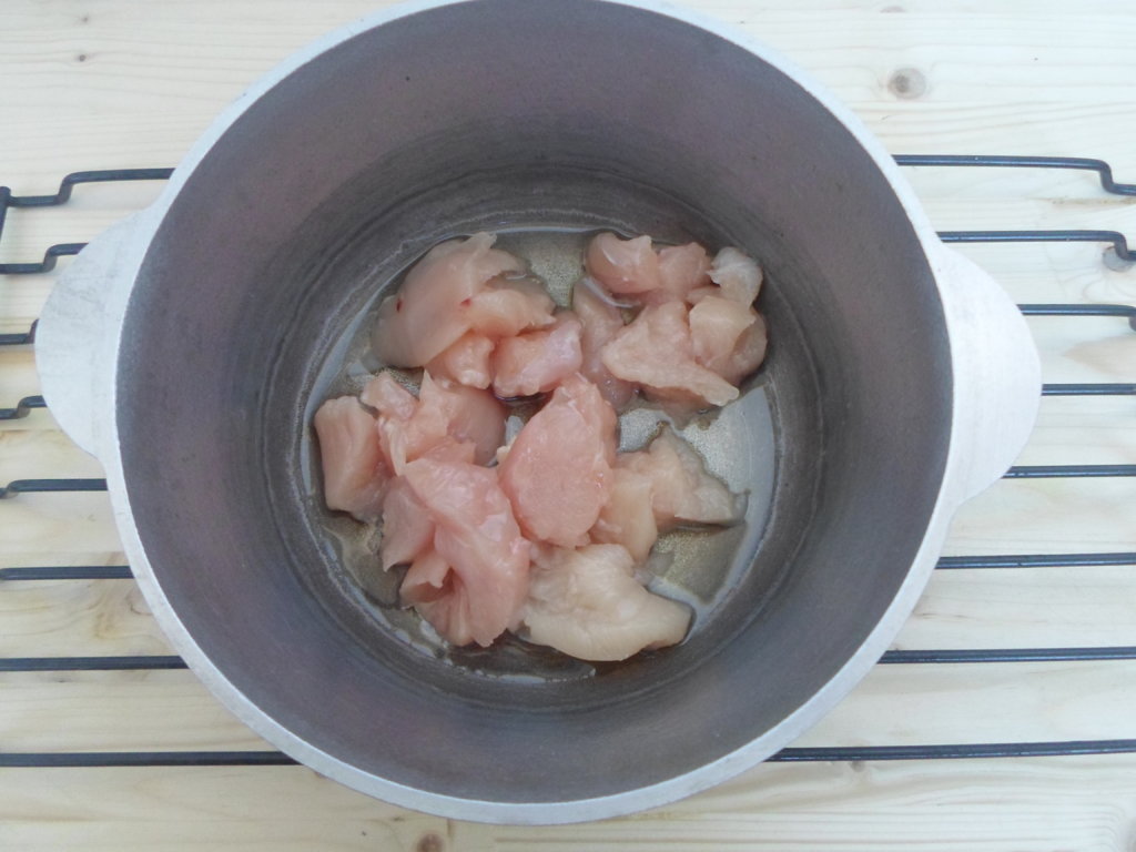 М’ясо наріжте не дуже великими шматками і злегка обсмажте в невеликій кількості рослинного масла.