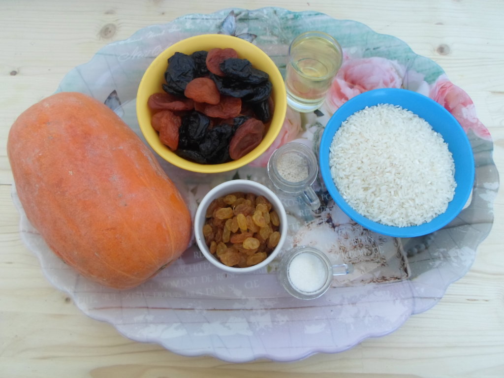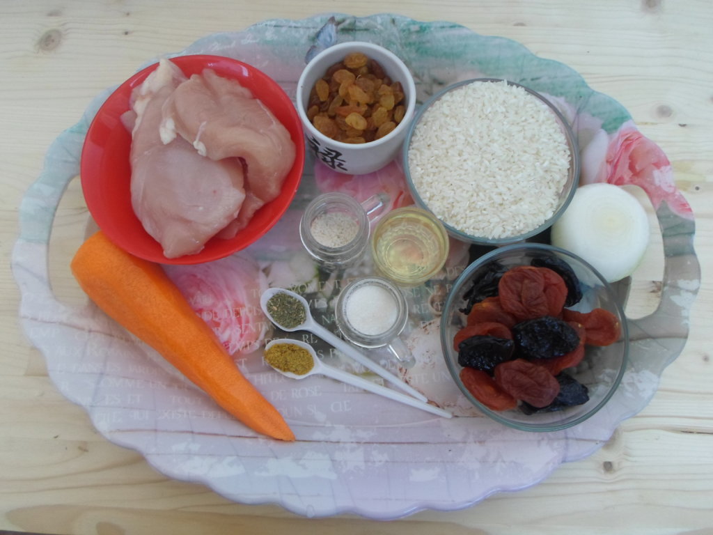 Підготуєте всі необхідні продукти. Сухофрукти можна брати будь за смаком, але найбільш доцільним є поєднання: родзинки, курага і чорнослив. Завдяки збалансованому складу, плов вийде не просто смачним, але і дуже корисним.