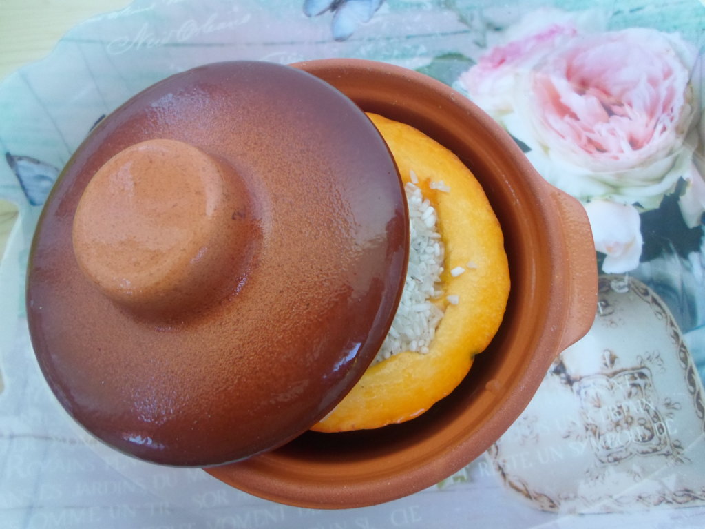 Можна запікати гарбуз в керамічному горщику, якщо ви використовуєте більш великі плоди, покладіть їх на деко. Залийте вміст гарбуза гарячою водою (до країв і накрийте кришкою або шматочком харчової фольги.