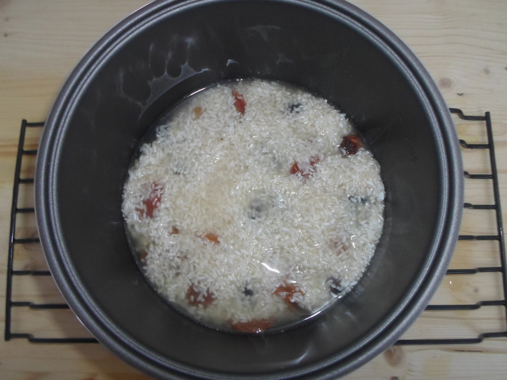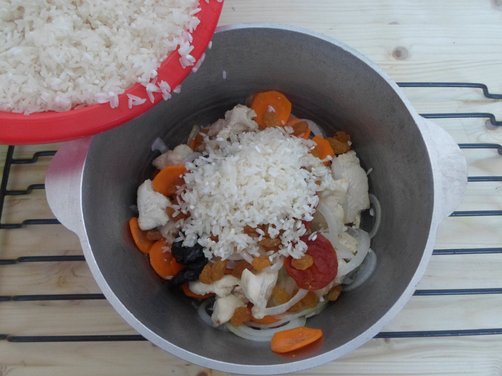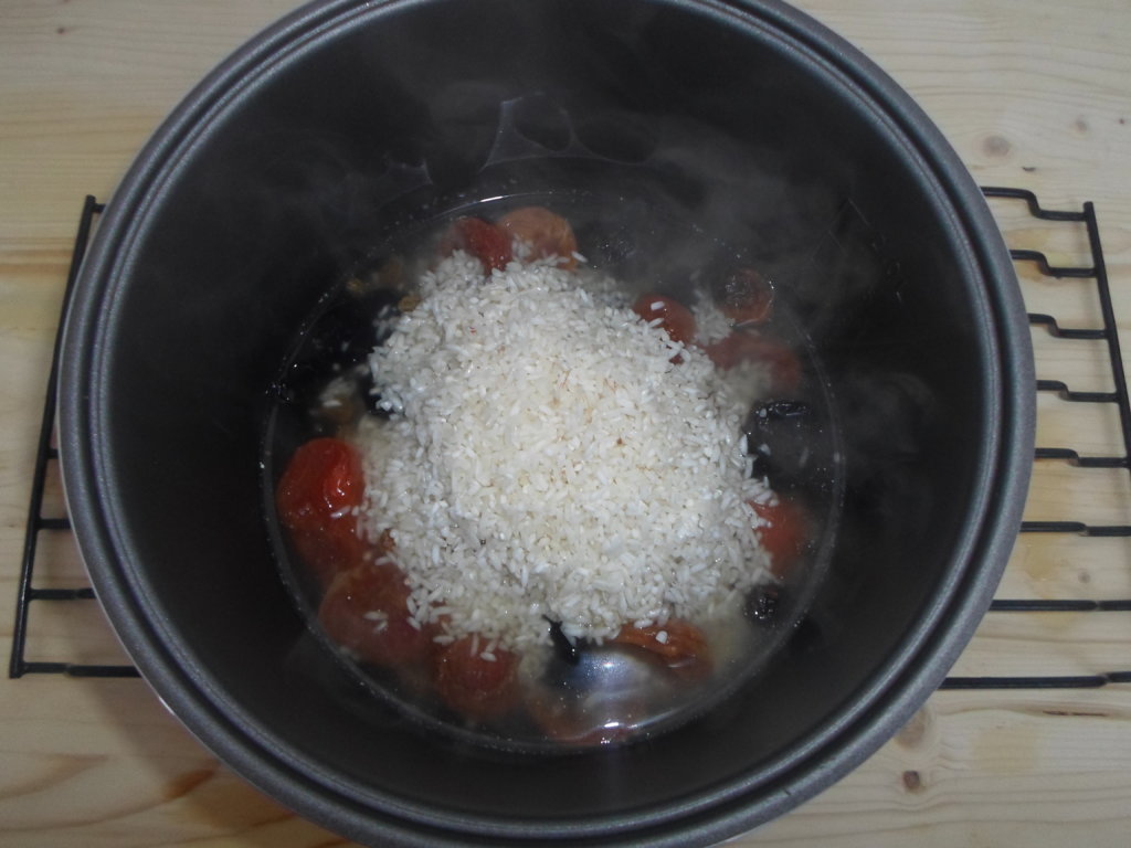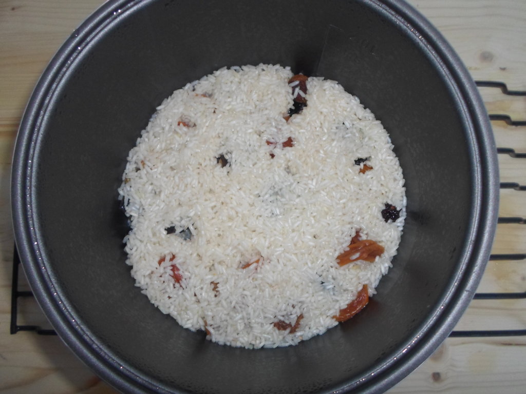 Тушкуйте сухофрукти 10 хвилин, щоб вони досить добре розм’якшилися, і додайте рис.