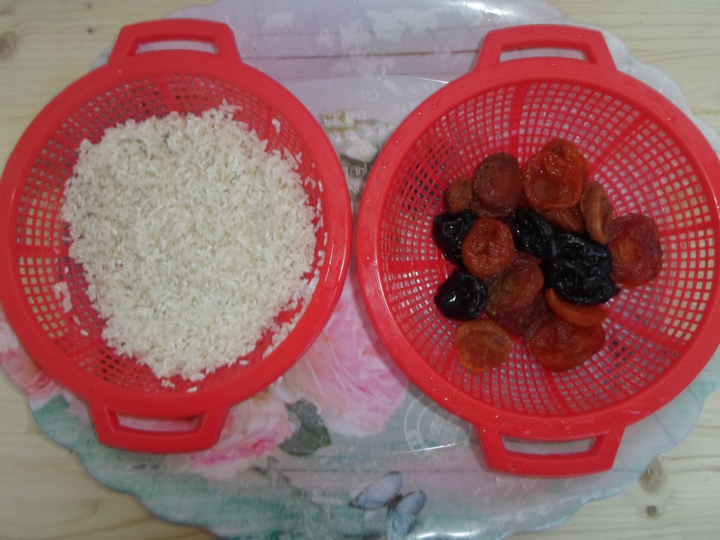 Рисову крупу і сушені фрукти промийте, відкиньте на ситечко, щоб стекла зайва рідина.