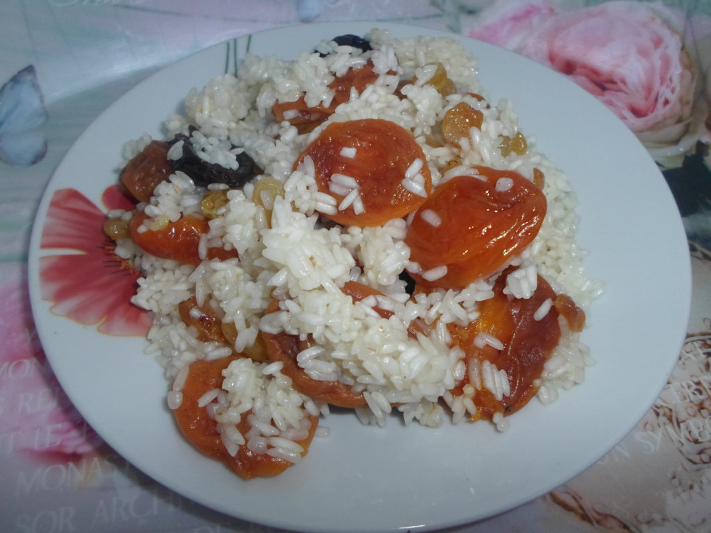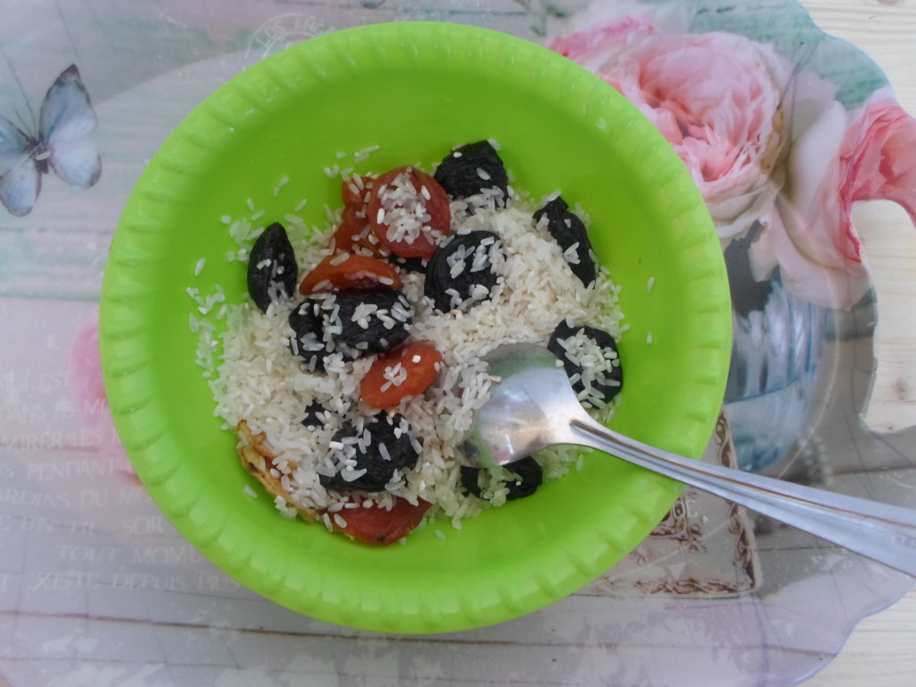 Коли вода в сухофруктах охолоне, злийте її. Змішайте їх з рисом, додайте трохи солі і цукру (не обов’язково).
