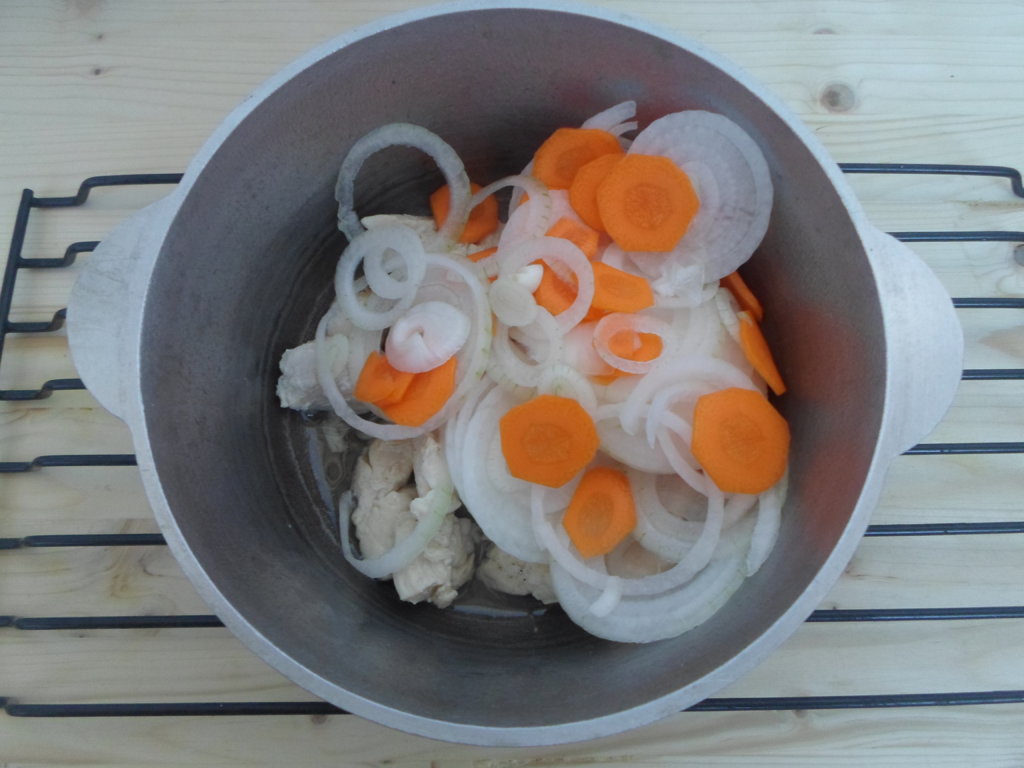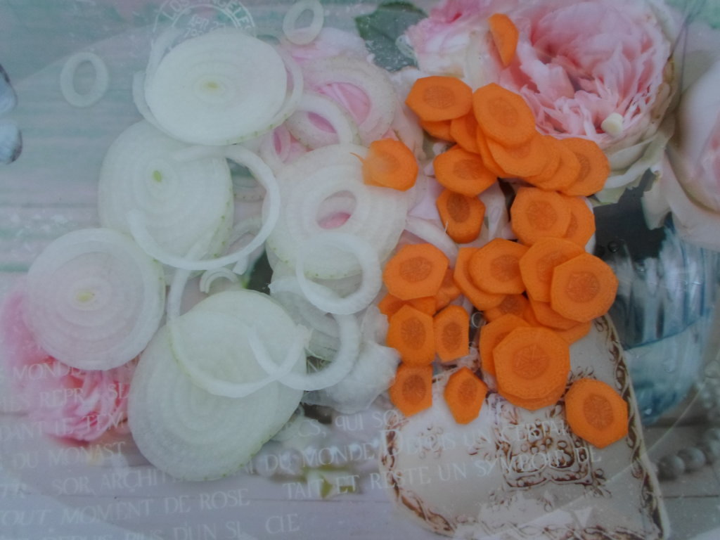 Цибуля бажано брати білий або червоний ці сорти мають більш м’який смак. Якщо вам попався гострий лук, опустіть його на кілька секунд у гарячу воду, це прибере зайву різкість. Цибулину і моркву нашаткуйте тонкими кільцями або брусками.