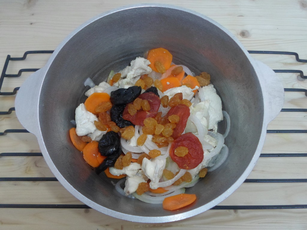 Промити чорнослив, курагу і родзинки в проточній воді і додайте до м’яса і овочів.