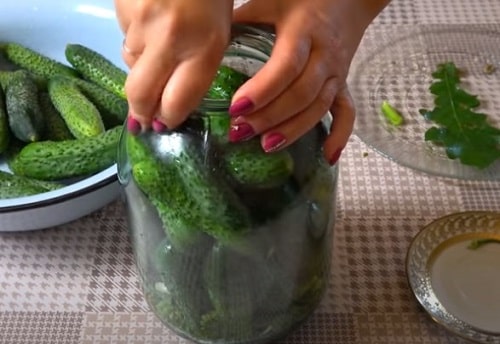 Помийте овочі, зріжте хвостики, якщо вони з грядки. Наповніть ємності огірками. Укладайте щільно.