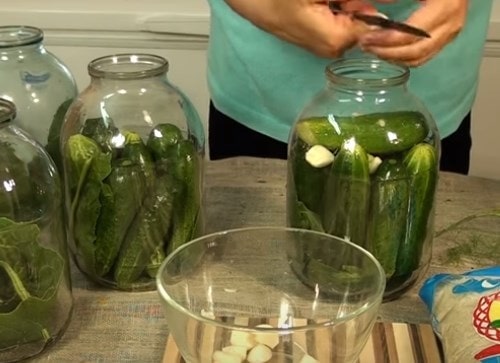 - Наповніть балони огірками. Укладіть зверху залишки зелені, цибулі і порізаний часник.