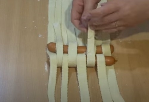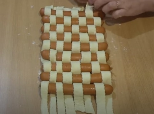 Непарними смужками, які ми не піднімали наверх, накрийте ковбаски у зворотний бік.