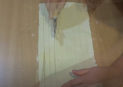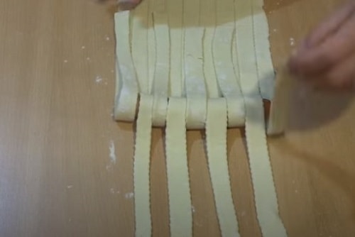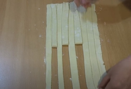 - Припудріть робочу поверхню столу борошном, розкладіть пласт. Наріжте смужками шириною 2 сантиметри.