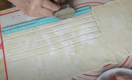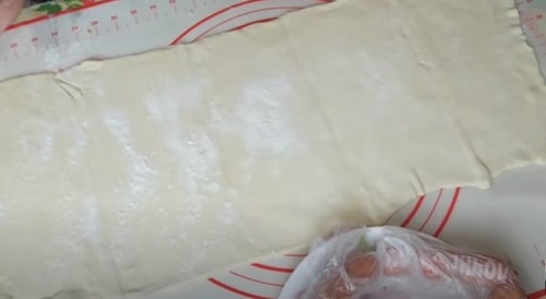 - Розморозьте готовий пласт, але не до кінця. Зручніше працювати з трохи підмороженого масою. В іншому випадку вона буде занадто липкою.