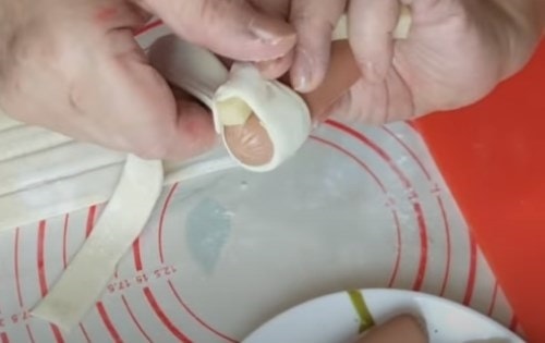 Складіть ковбаску з смужкою сиру парою. В іншу руку візьміть стрічку тесту. Почніть загортати сосиску.
