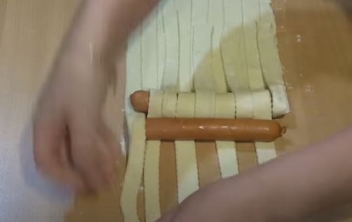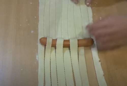 Покладіть рівно посередині сосиску, загорнуті наверх смужки поверніть назад, вони повинні виявитися поверх ковбаски, дивіться на фото, як це зробити.