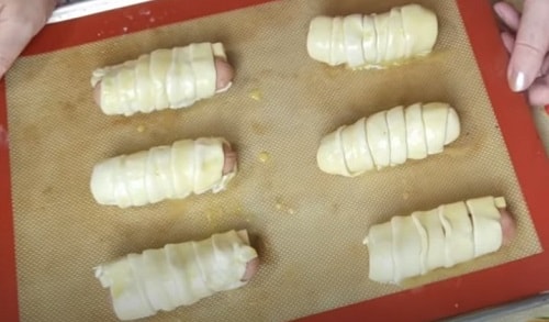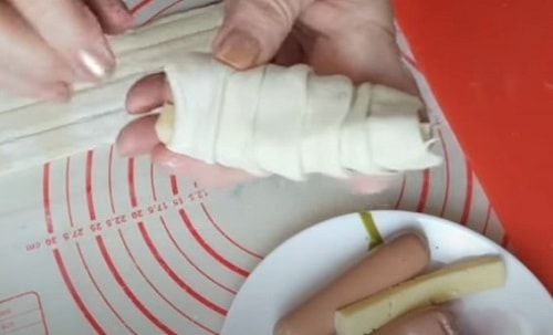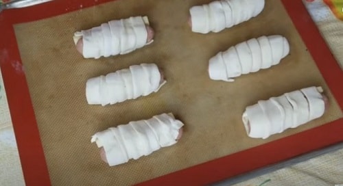 - Загорніть ковбаски, як показано в покроковому рецепті, роблячи оберти навколо трохи внахлест. Закріпіть краю.
