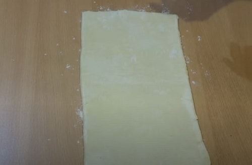 Розморозьте упаковку в природних умовах. Розкладіть на столі, добре розправте. Щоб пласт не прилипав до стільниці, припудріть її борошном. Не розгортайте пласт, оскільки товщина для випічки найкраща.