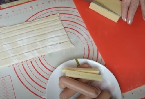 Я вирішила додати начинку сир, тому в приготуванні додався ще один крок – його нарізання тонкими пластинами. Знову ж таки, за кількістю сосисок.