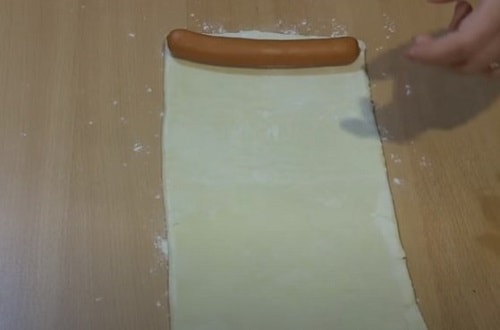 Поділіть великий пласт на прямокутні частини. Ширина шару повинна дорівнювати довжині сосисок. Довжина не має значення.