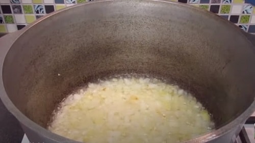 Хлюпніть на дно каструлі масло, добре прогрійте його на повному вогні. Закиньте цибульні кубики. Обсмажуйте до красивої золотистої.
