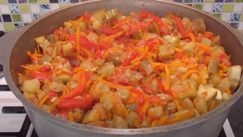 - Наріжте брусочками баклажани, обсмажте у великій кількості масла. Слідом додайте цибулю, порізану кубиками. Потім порізаний красивою соломкою солодкий перчик. Додайте терту моркву і помідори, кришеним кубиками.