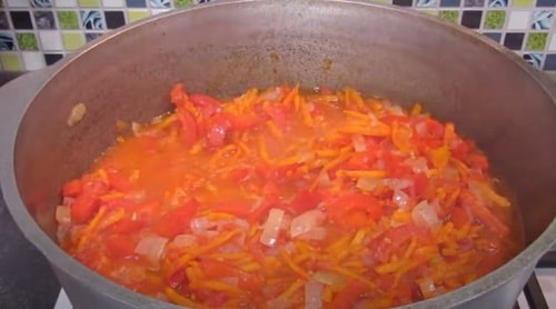 - А при масла, обсмажити цибулю з морквою, відправте за синенькими. Далі йде жарка перцю і помідорів.
