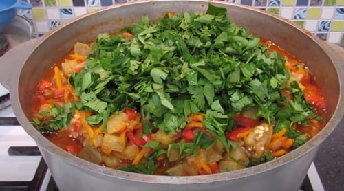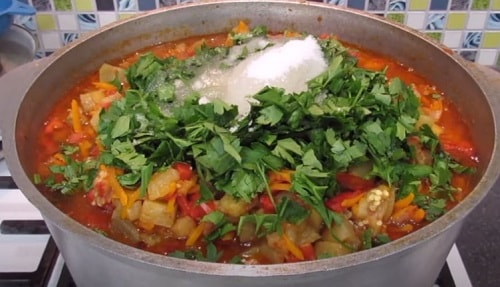 - Порубати петрушку, відправте в блюдо. Готуйте при тихому «булькання» ще 8-10 хвилин. Перевірте готовність овочів, при необхідності додайте час приготування.