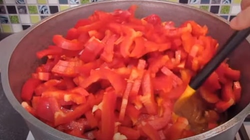 - Обсмажте нарізку синенькі. На окремій сковорідці посмажте солодкий перчик.