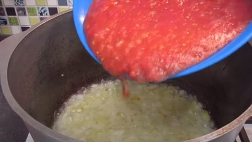 - Додайте помідори, очищені від шкірки і перетворені за допомогою блендера в пюре. Старанно перемішайте вміст.