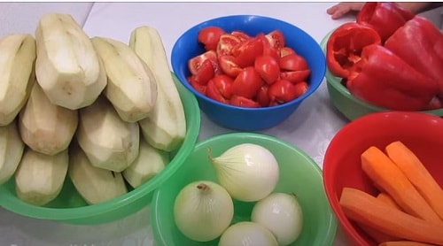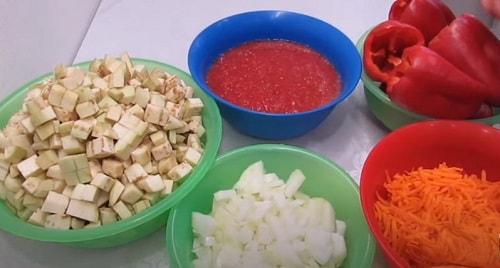 - Як і в попередніх рецептах соте з баклажанів, всі овочі подрібнюються кубиками або скибочками.